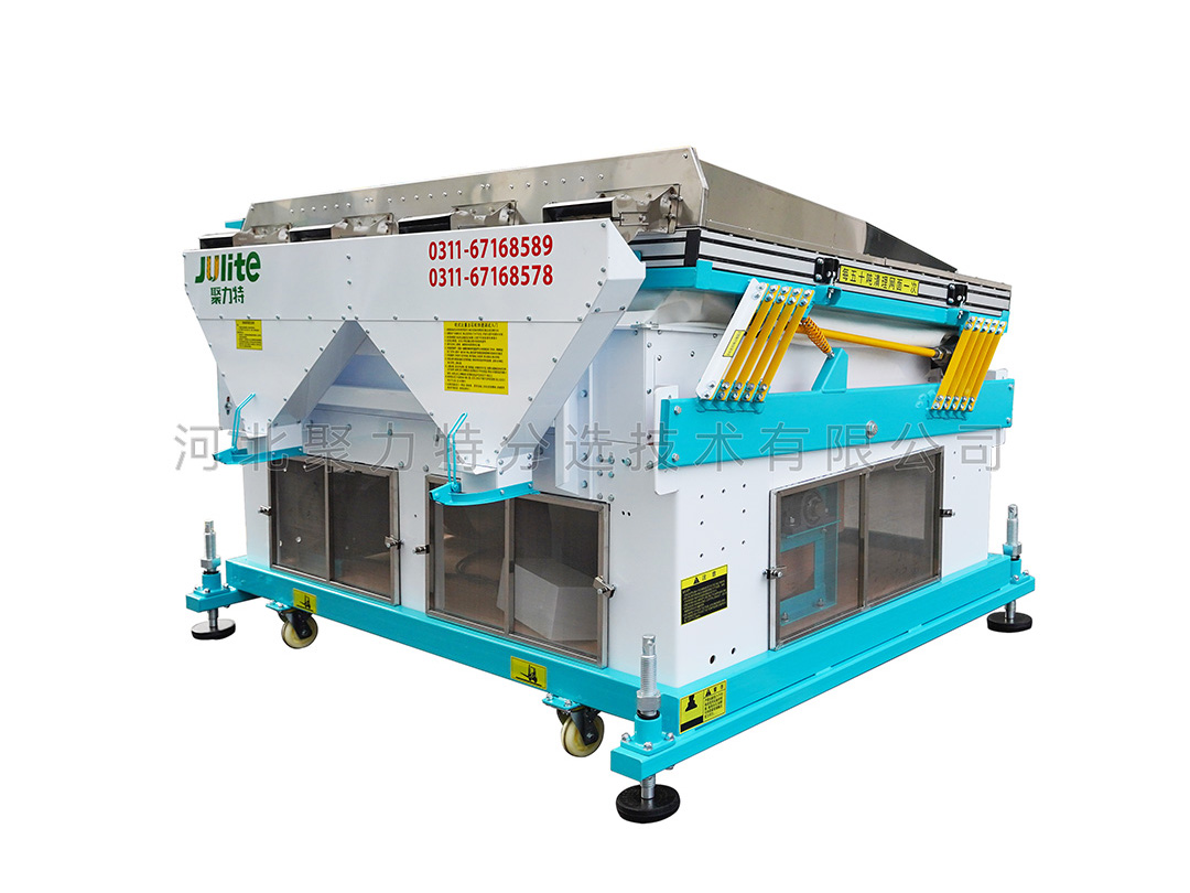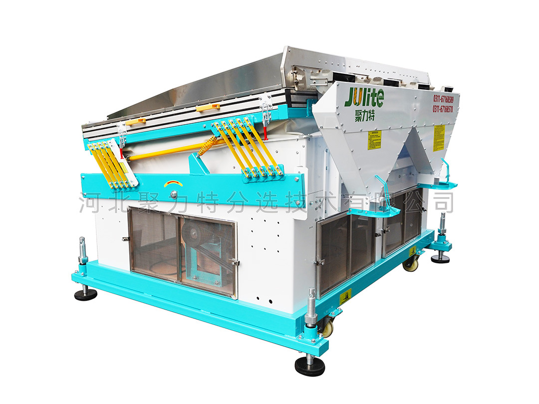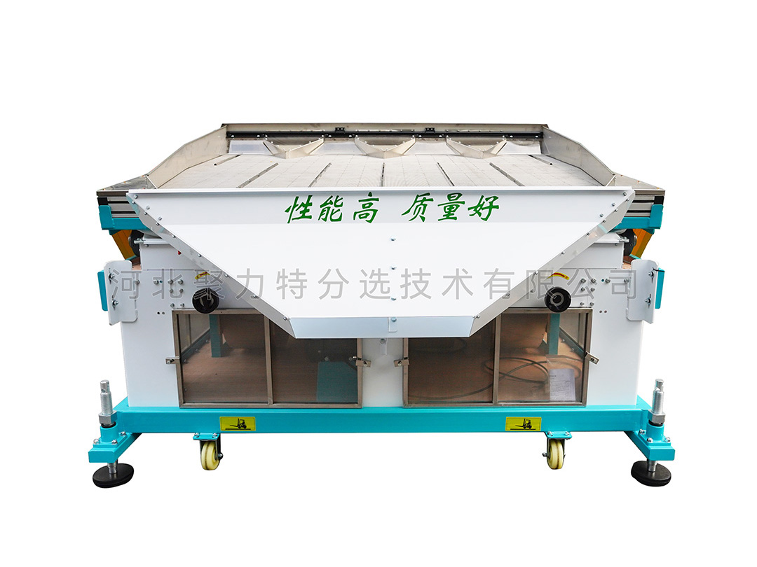 適用于單一目的物料的選別,能把物料中的并肩石(與物料粒度大小相似的砂石)等較重的雜質(zhì)有效去除。在糧食加工的工藝流程中應(yīng)安裝在篩選流程的后段工序,未經(jīng)去除大、小、輕雜質(zhì)的原料,不應(yīng)直接進入該機,以避免影響去石效果。