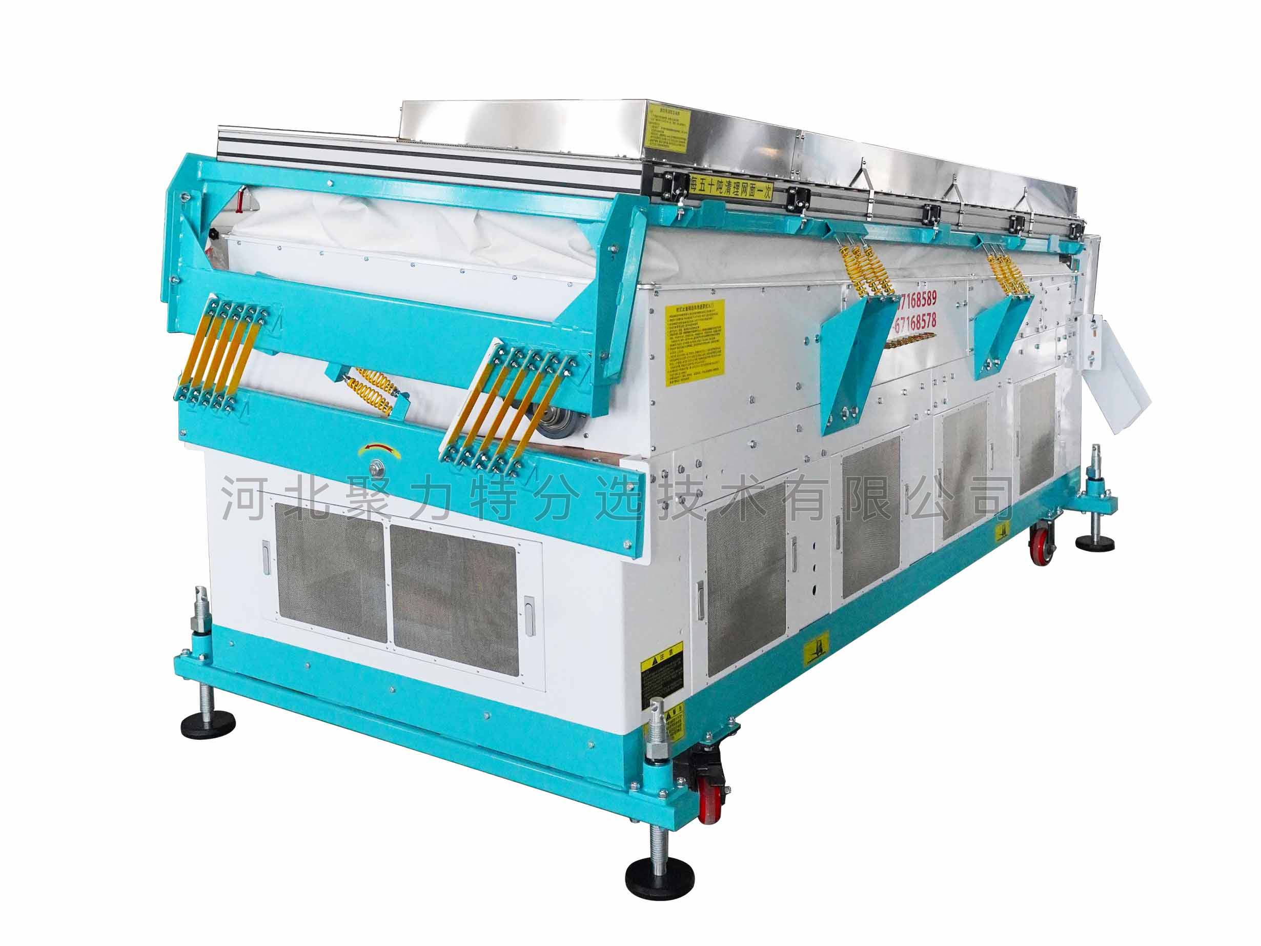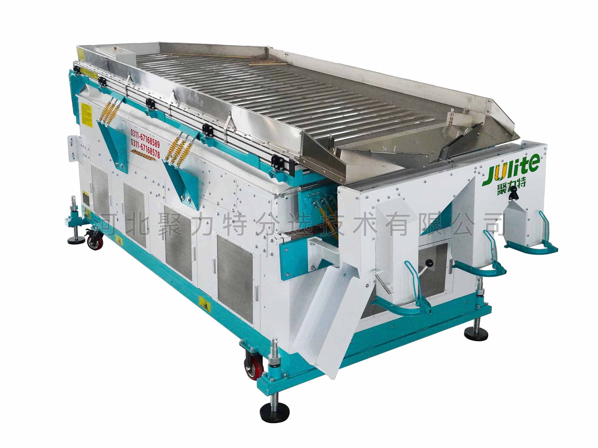 吹式比重精選機(jī)是根據(jù)物料在空氣動(dòng)力和振動(dòng)摩擦力的雙重作用下產(chǎn)生比重偏析的原理,通過調(diào)整風(fēng)壓、振幅等技術(shù)參數(shù),使比重較大的物料沉到底部貼著篩面由低向高運(yùn)動(dòng);比重較小的物料懸浮在表面由高向低運(yùn)動(dòng),從而達(dá)到比重分離的目的。有效去除物料中的秕籽、芽籽、蟲蛀粒、霉變粒、黑粉病粒等比重較輕的雜質(zhì);同時(shí)比重精選機(jī)振動(dòng)臺(tái)面上部設(shè)有一個(gè)去石傾角,能將物料中的石子分離出來。